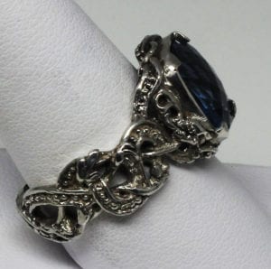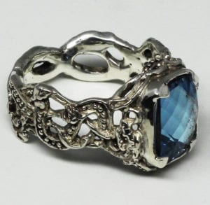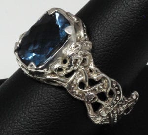The Viking Dragon blue topaz ring was inspired by both Viking and Celtic art. Gripping beast designs were favorites of the ancient Celts as well as the Vikings. They appear in works of art from the designs carved into Viking long ships to ancient Celtic manuscripts like the “Book of Kells.” Suzan hand carved this ring and then cast and finished it all by hand. The ring is made of sterling silver. It is set with a beautiful 10 mm X 12 mm checkerboard cut blue topaz. A fierce dragon guards the stone on either side. The ring is a size 8.