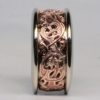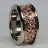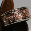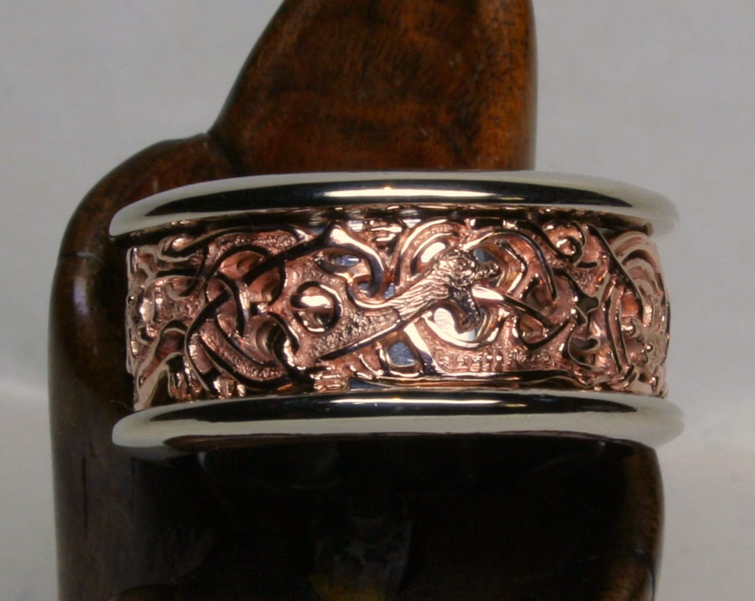 I combined elements of both the new and old carvings in the center of the band to form a garland of gripping beasts. I carved the details in wax and cast them in red 14k gold. I placed the central design between two borders of white gold. The borders are high enough to protect the band’s details to insure that it will last many years. The inside edges of the band are rounded to ensure that the band will be comfortable to wear.