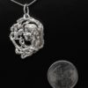 It’s a shame that I can’t let you hold this pendant it really is very 3D which doesn’t really show in pictures. Suzan carved and built up her design in wax and then worked on it in the metal after it was cast. The young woman’s face, the pinecones, and the rest of the details in this pendant are beautifully carved. The pendant is 1 5/8″ X 1 1/8″ in size including its bale. A chain is not included but we will be happy to supply one in almost any length or style at a fair price. You can order the winter pendant in gold as a special order. You may also like these pieces that have nature inspired themes:Â https://postgatejewelers.com/product-category/flowers-vines-and-animal-jewelry/