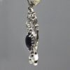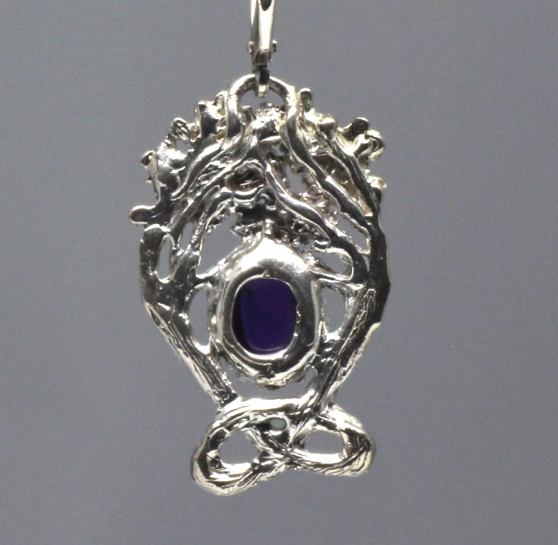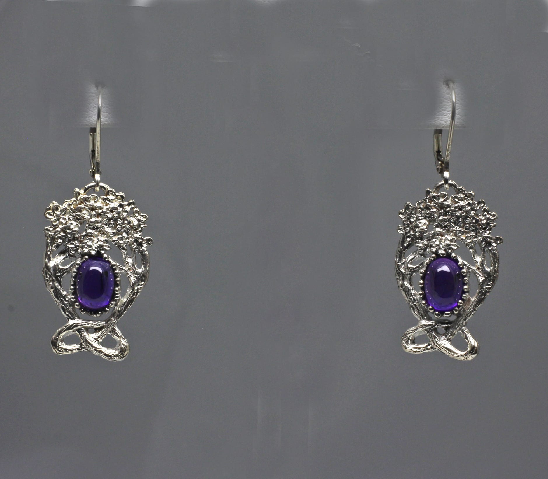 The earrings are made in sterling silver with lever backs. A deep purple amethyst cabochon is set in the center of the design. They measure 1″ tall X 3/4″ wide, not including their wires. These can be made with your choice of stones or even in gold as a special order. Special orders usually are sent out within 6 weeks.
