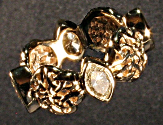 Our customers have asked for us to make some of our all time favorite pieces. The second band from the Left, for example, is a Viking gripping beast design. A woman from Texas asked me to make as one of the couple’s wedding rings. I have been a student of Celtic and Viking art for a long time but I hadn’t focused on gripping beast design. The order gave me a chance to familiarize my self with gripping beast designs. After going through my books and an online search, I decided that the carvings on the Oslo Viking ship would be perfect for their rings. The power of the figures in the carvings was so strong that you can imagine the thoughts of the person(s) while they were carving them.Her wedding ring was also a gripping beast design but with a stone added. You can find examples of a ring like hers with a ruby, and also a version of the ring with an alexandrite set in it in the images on this page.
