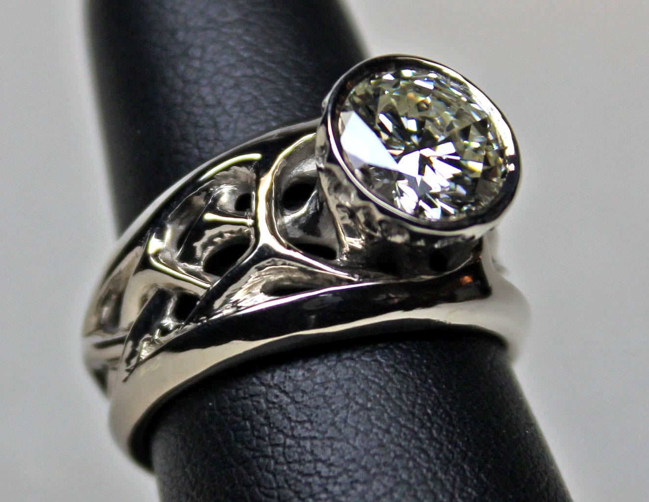 Choose just about any of our bands and wedding rings designs and we will make them for you in white, yellow or rose gold. You can choose the type of stone or stones that you would like as well. You can see from the viking beast commission, that we are open to designing rings based upon a wide range of ideas. It is important that you like our sense of design of course, since your commission will be influenced by it. So look through our designs. If you like what you see, we are sure that we can make you something that you will love. Just email us at: postgate@postgatejewelers.com We can also begin fresh, and make something new from a drawing or description. We don’t make many of our gold pieces in silver because of the time that goes into them. These are all hand made. Check out our Face Book site as well For more information:https://www.facebook.com/Postgate-Fine-Jewelers-111540785537658/?view_public_for=111540785537658