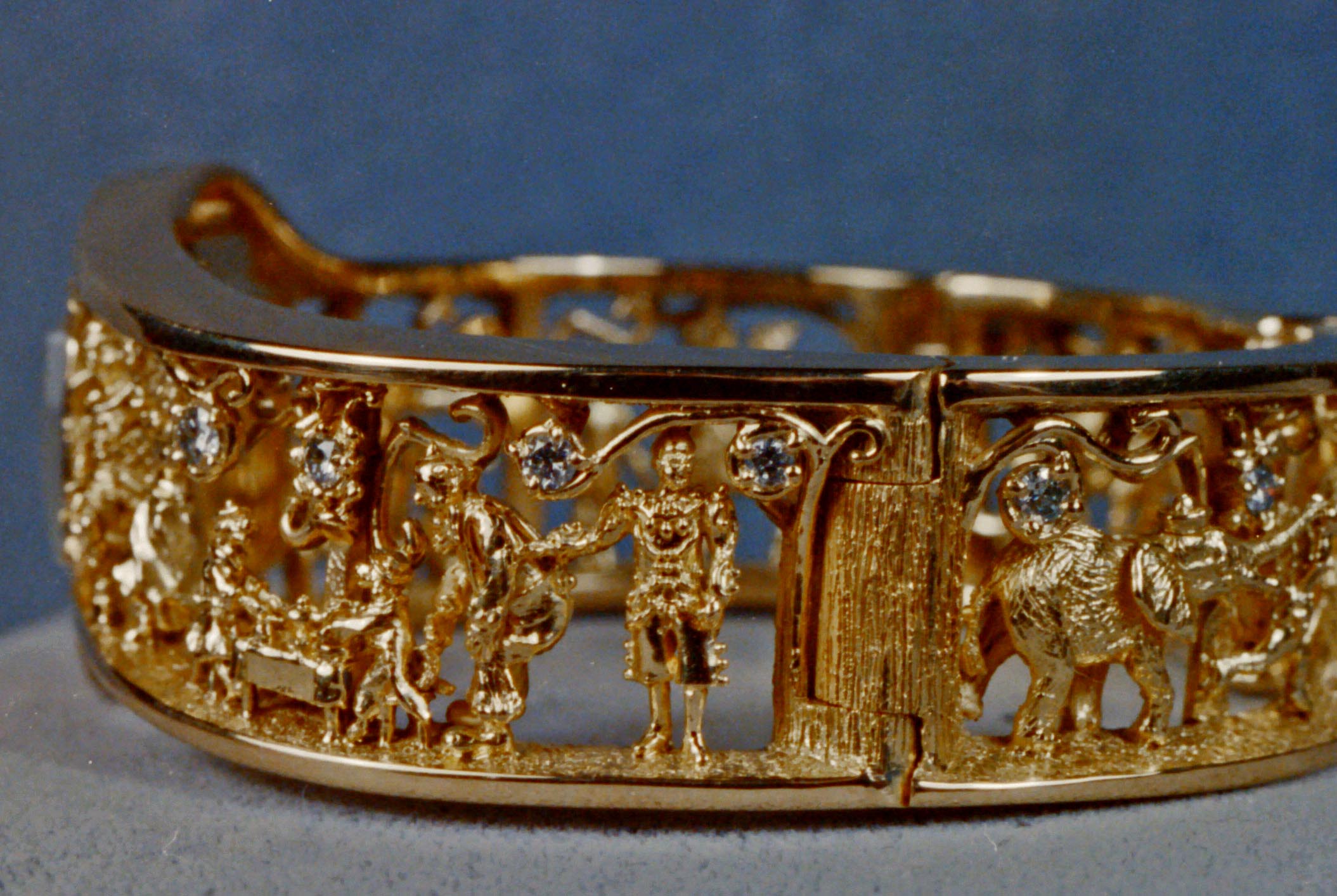 We’ve also created pieces like a family bracelet that depicts memorable scenes from a families life. One of my favorites shows a family’s special memories in its scenes. My favorite shows the parents arranging presents under their Christmas tree. They are unaware that their children are spying on them from a doorway. I made the scene look like their living room complete with fireplace and hanging stockings.Ā Our customer had sent us a photograph of their living room decked out for Christmas. I used the photo to create the scene in the bracelet. The father who commissioned the bracelet had also sent me a beautiful letter describing the moments that he wanted included. I also transcribed the family’s stories into a hand made book that doubles as the bracelet’s box. I copied his recollections into the book’s pages in calligraphy and illustrated his stories with paintings showing the scenes.