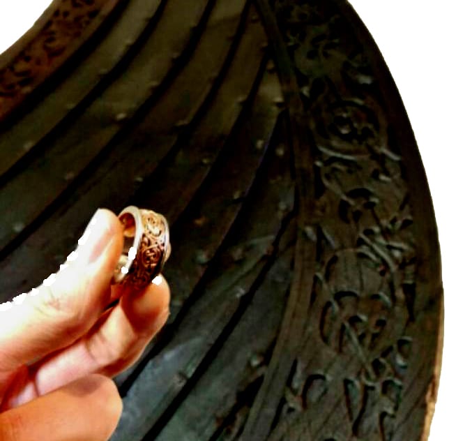 I got a special Viking wedding ring order from a couple in Texas several years ago. They got in touch because the jewelers in their area had no idea what gripping beast Viking designs were. I was quite familiar with the gripping beast designs from Celtic art work like the Book of Kells. That helped, but I still had to dig through my materials to find a design that would work. I found the perfect design in the carvings on the famous Oslo Viking ship. Following the carvings on the ship, was like being a needle following the grooves in a record. I began to imagine that I could understand the thoughts and motivations of the original artists. The gripping beasts that decorate the prow and stern of the beautiful long boat are very busy. They seemed to come to life swimming through each other to make a chain of strange living creatures. I sometimes feel that I can hear the rhythm and flow of a design as if it was music. The designs on these rings are good examples of pieces that seem like music as I follow them. Some of the designs seem light hearted and entertaining. Some of the other designs seem to be meant to scare off the creatures of the mysterious ocean.