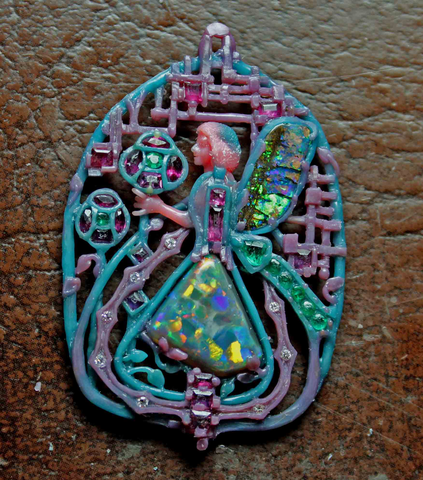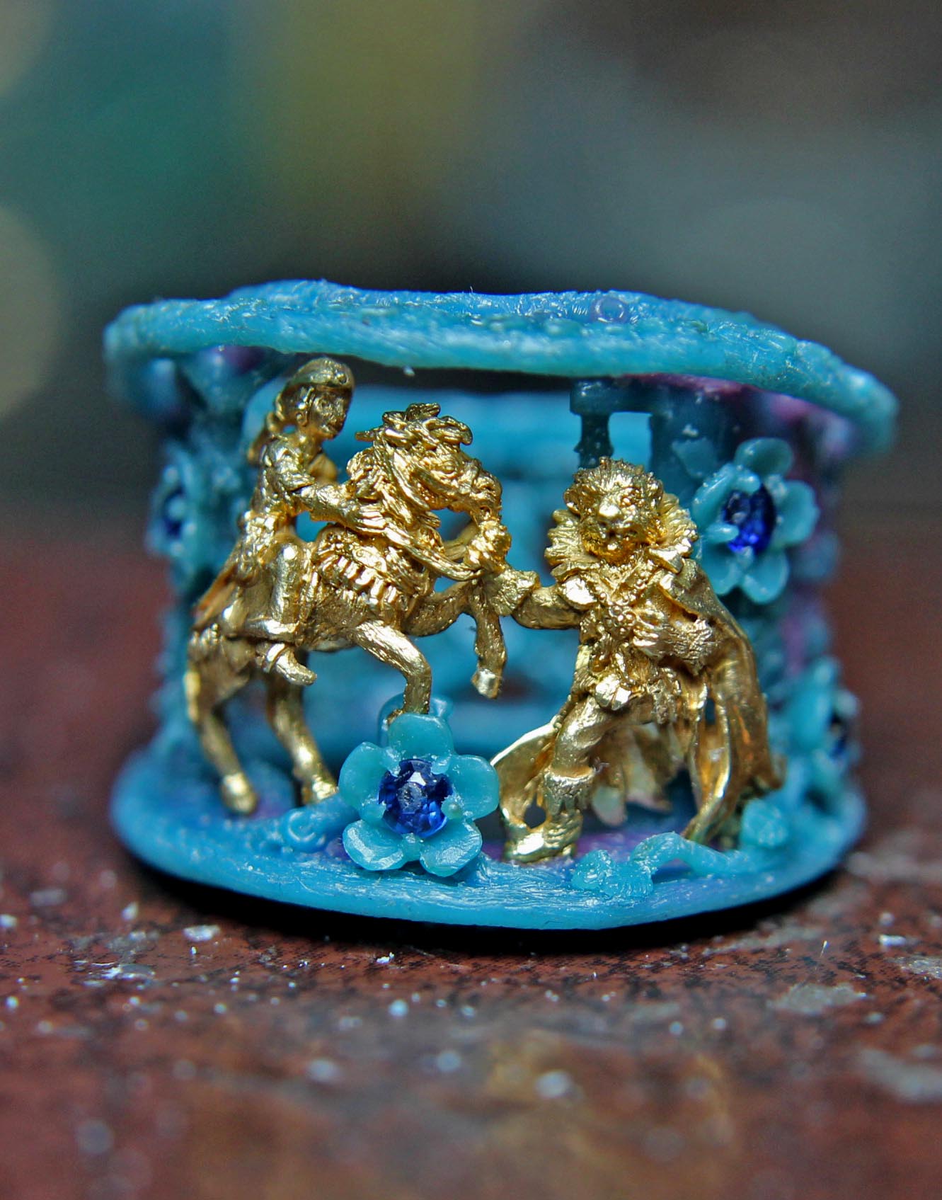 Liquid wax, can be drawn into the air slowly to extend a feature as it cools. The branches and leaves on our trees as well as the hairs on a unicorn's mane are done like this. One of my favorite examples is below it a setting for an old cameo. I used the techniques here to create it, nearby is the same piece finished. This is a very ancient process.